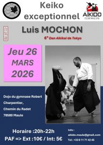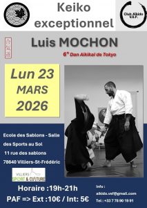 Luis MOCHON 6ème dan (élève de ENDO Senseï et enseignant à Grenade) animera des keiko exceptionnels les lundi 23 mars à Villiers St Frédéric, mardi 24 mars à Vernon, jeudi 26 mars à Maule et vendredi 27 mars à Ivry-la-Bataille.